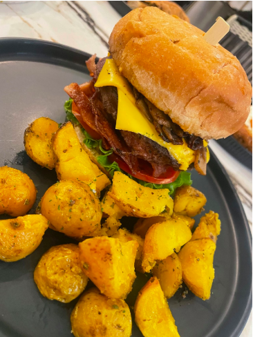 Carne de res, queso cheddar, tocineta, champiñones, lechuga, tomate, cebolla, salsa chipotle. Servida con papa criolla.