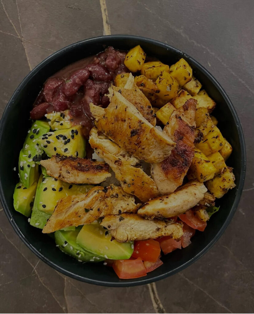 Arroz, fríjol, lechuga, tomate en cuadros, aguacate, plátano maduro y 120g de pollo. Servido con alioli de pimentón.