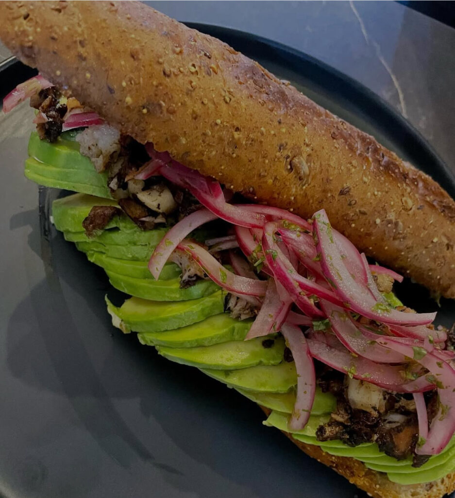Tostada de pan artesanal, aguacate, tocineta, tomate cherry, sour cream, cebolla morada y huevo